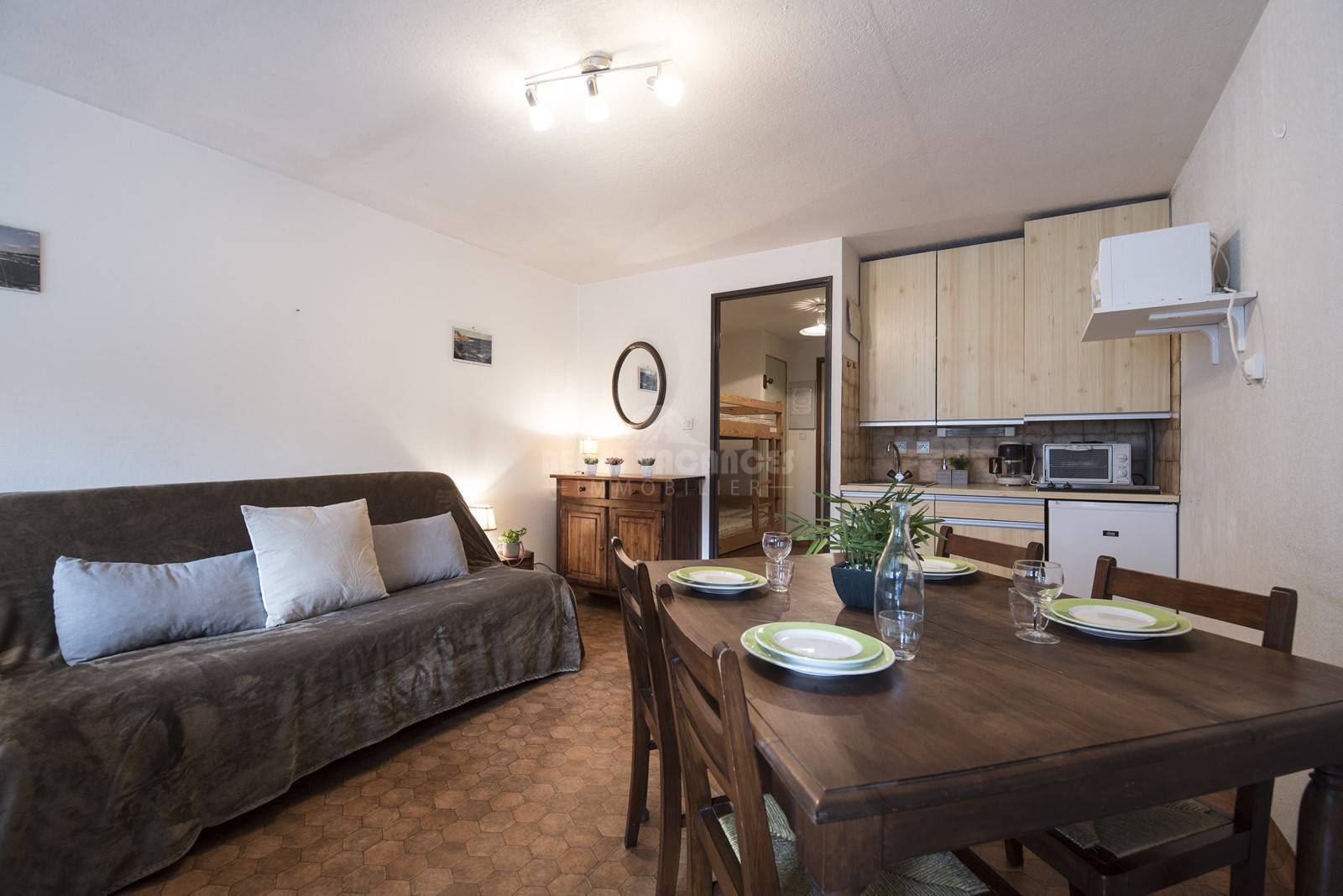 La pièce principale se compose d'une kitchenette équipée, d'un séjour avec un canapé lit 2 personnes, et d’un téléviseur.