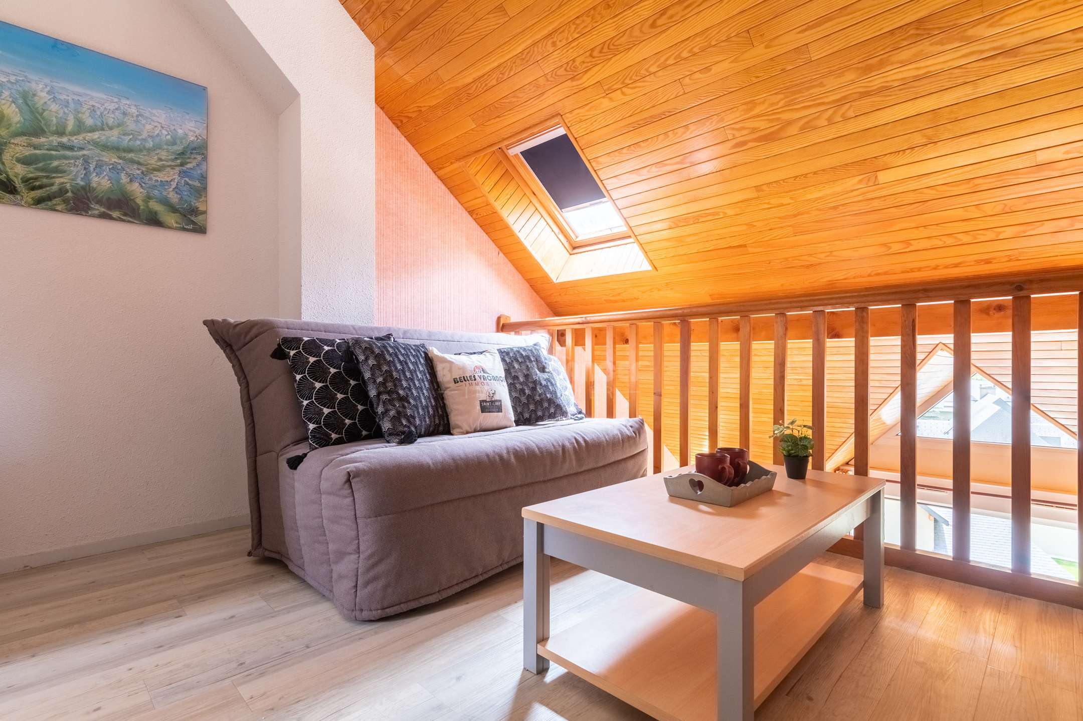 Concernant le second niveau, vous trouverez une mezzanine équipée d'un canapé lit 2 places confortable et enfin une chambre avec 2 lits 1 place .