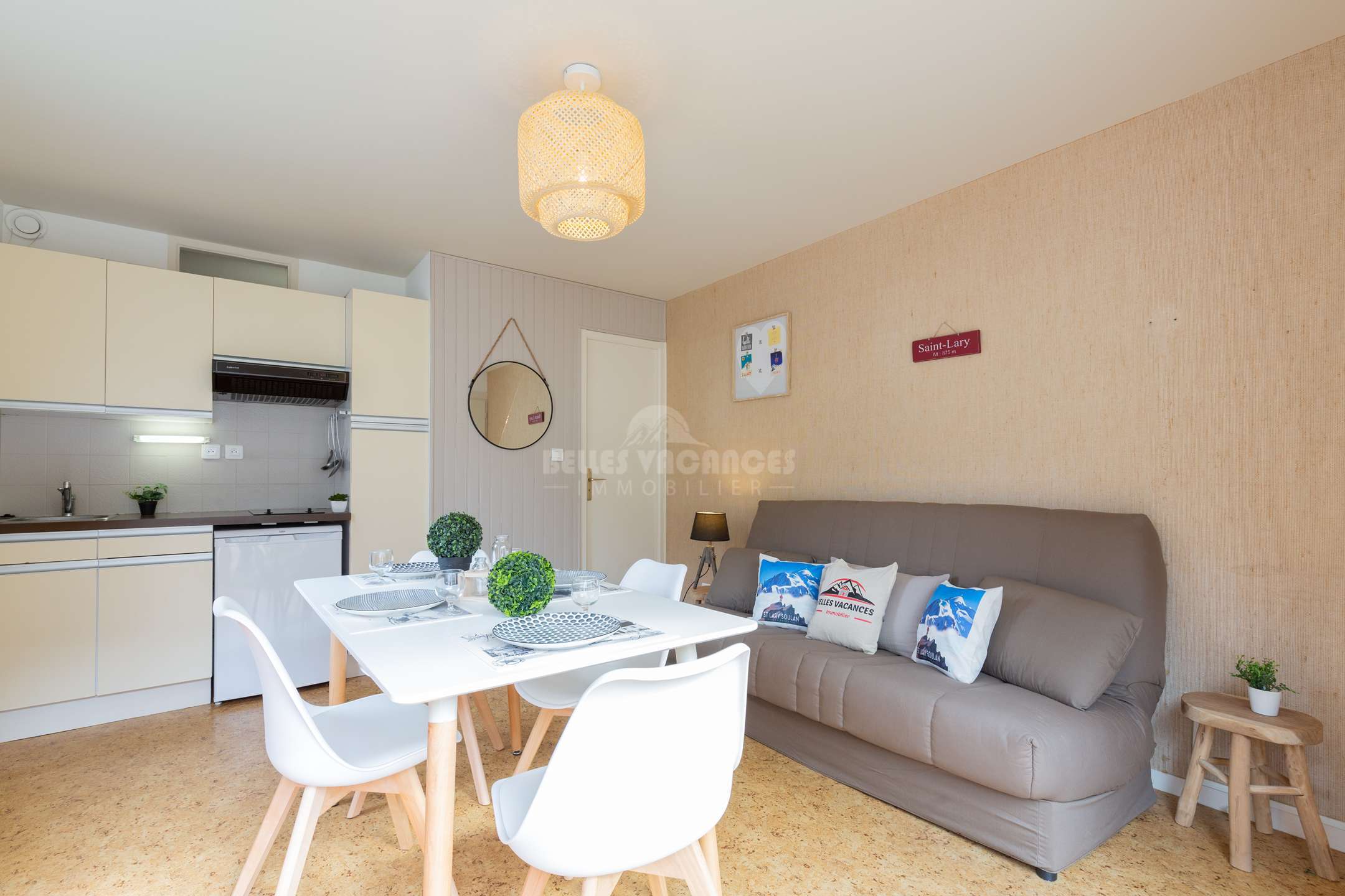 Entrée avec 2 lits superposés, Cuisine équipée et aménagée ouverte sur le séjour, Salle d'eau, wc séparés