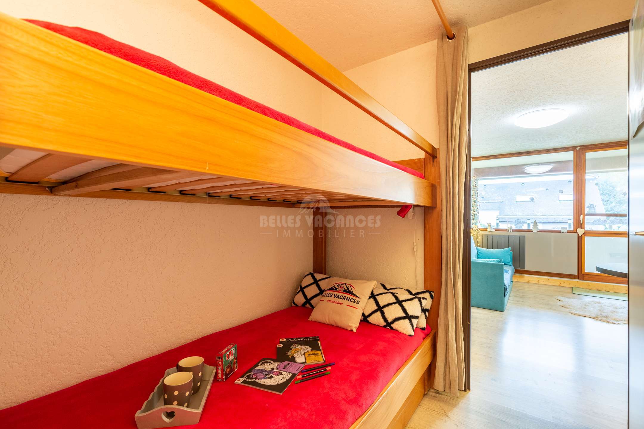 Dans l'entrée couloir vous trouverez 2 lits superposés en 90, une salle de bain et un wc séparé.