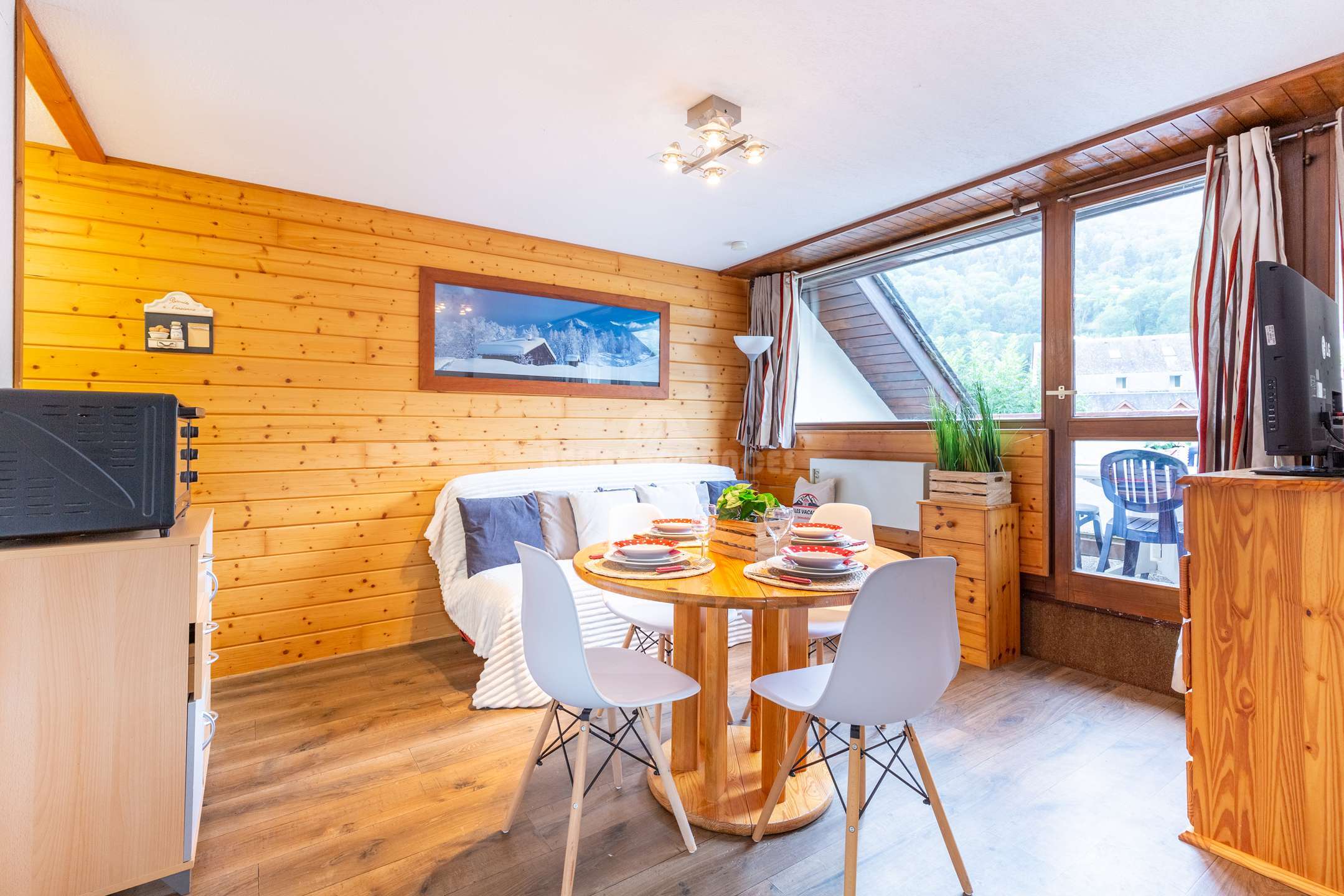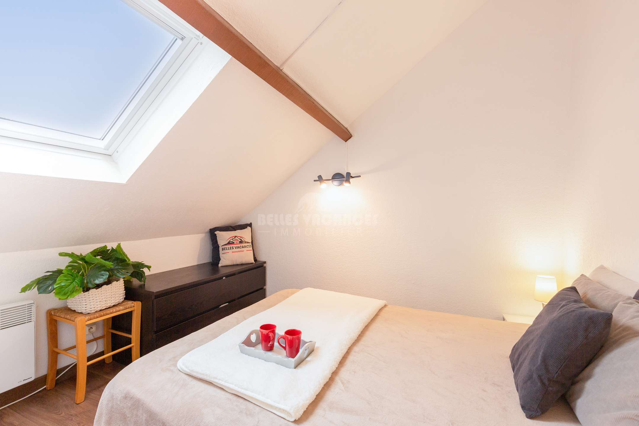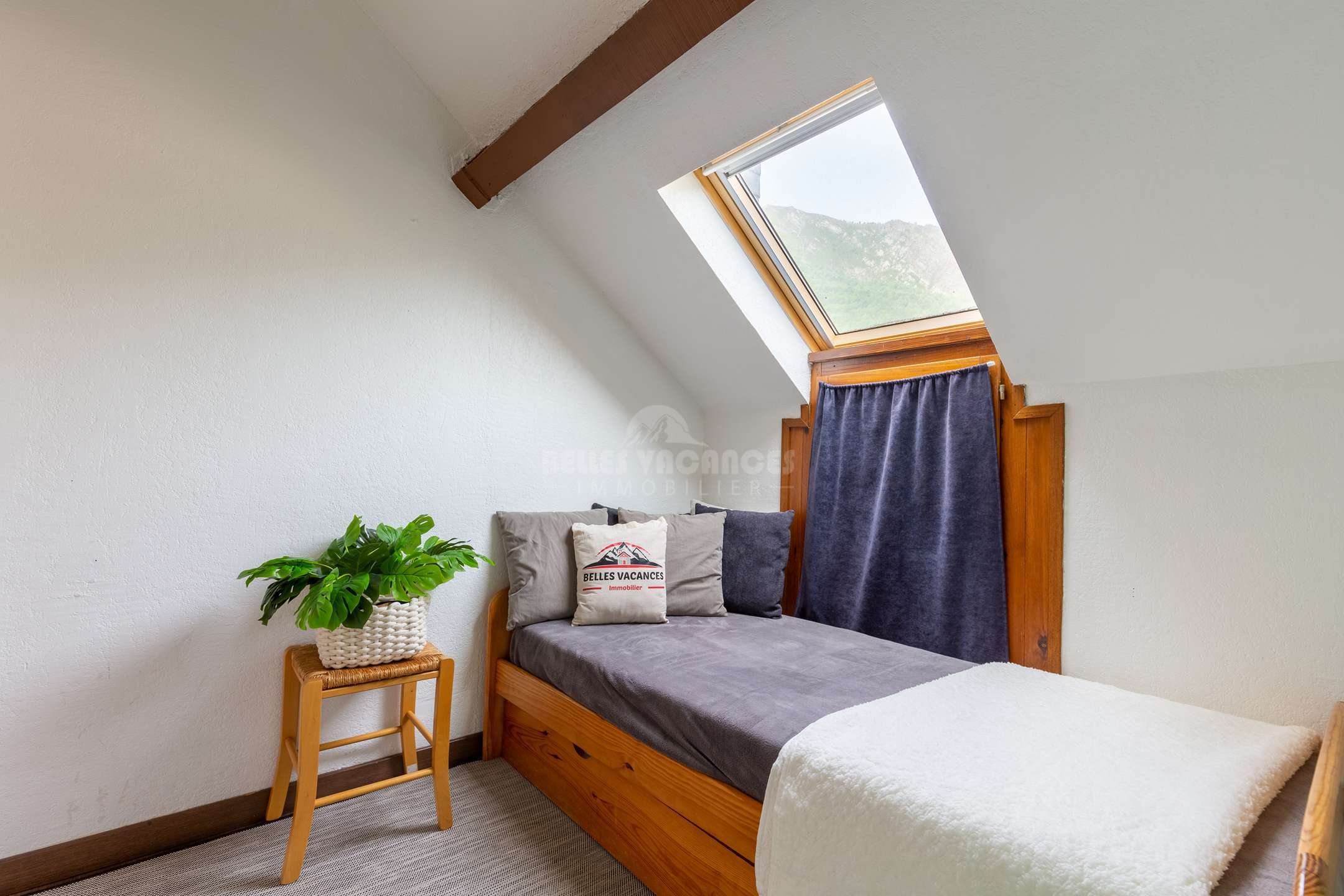 Une chambre avec un lit en 140 et une chambre avec des lits gigognes. Canapé clic-clac dans la pièce de vie si besoin.