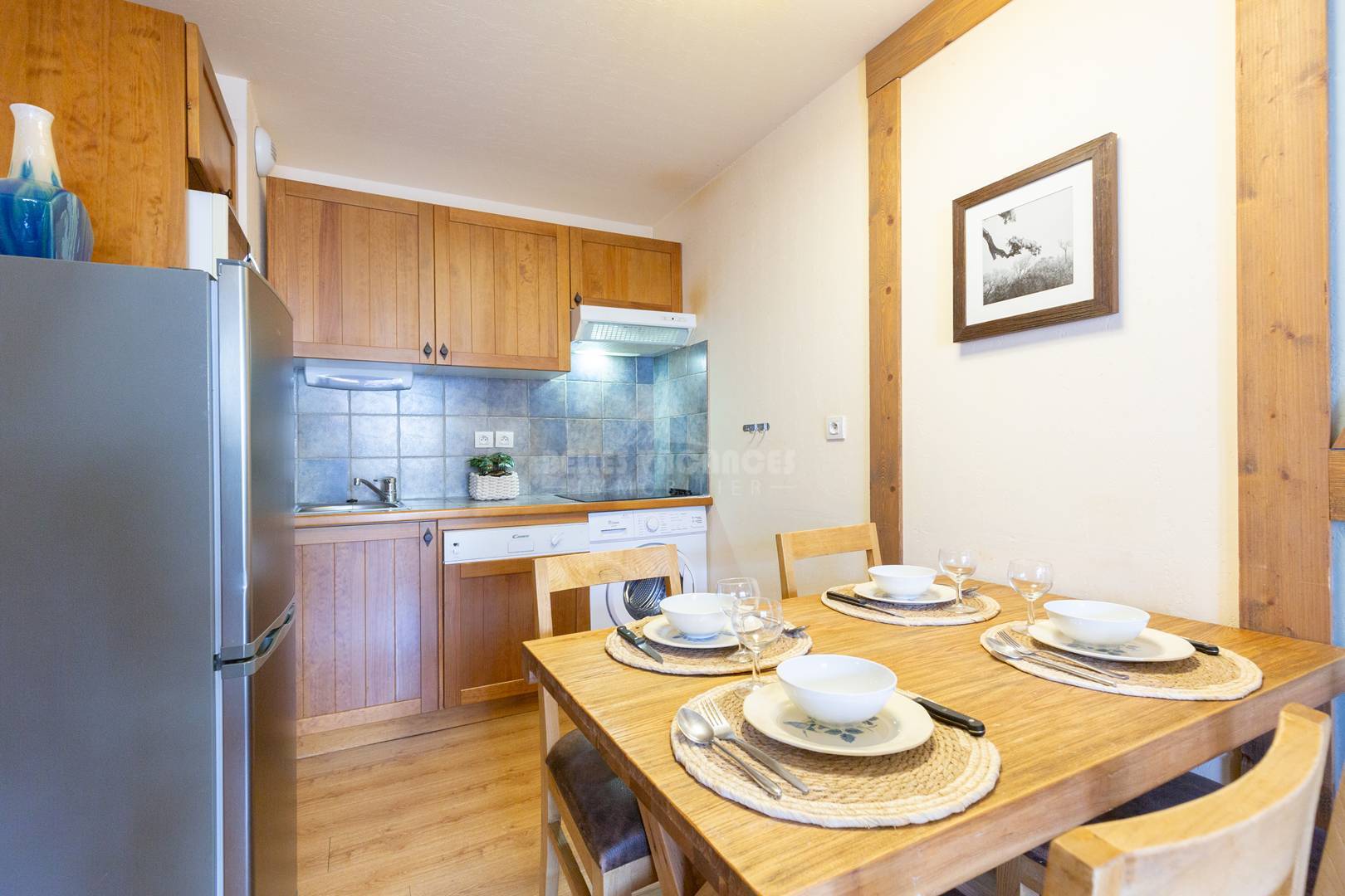 La cuisine équipée est ouverte sur le séjour ( plaques vitrocéramique, micro-ondes, lave-vaisselle, lave linge, frigo/congélateur)