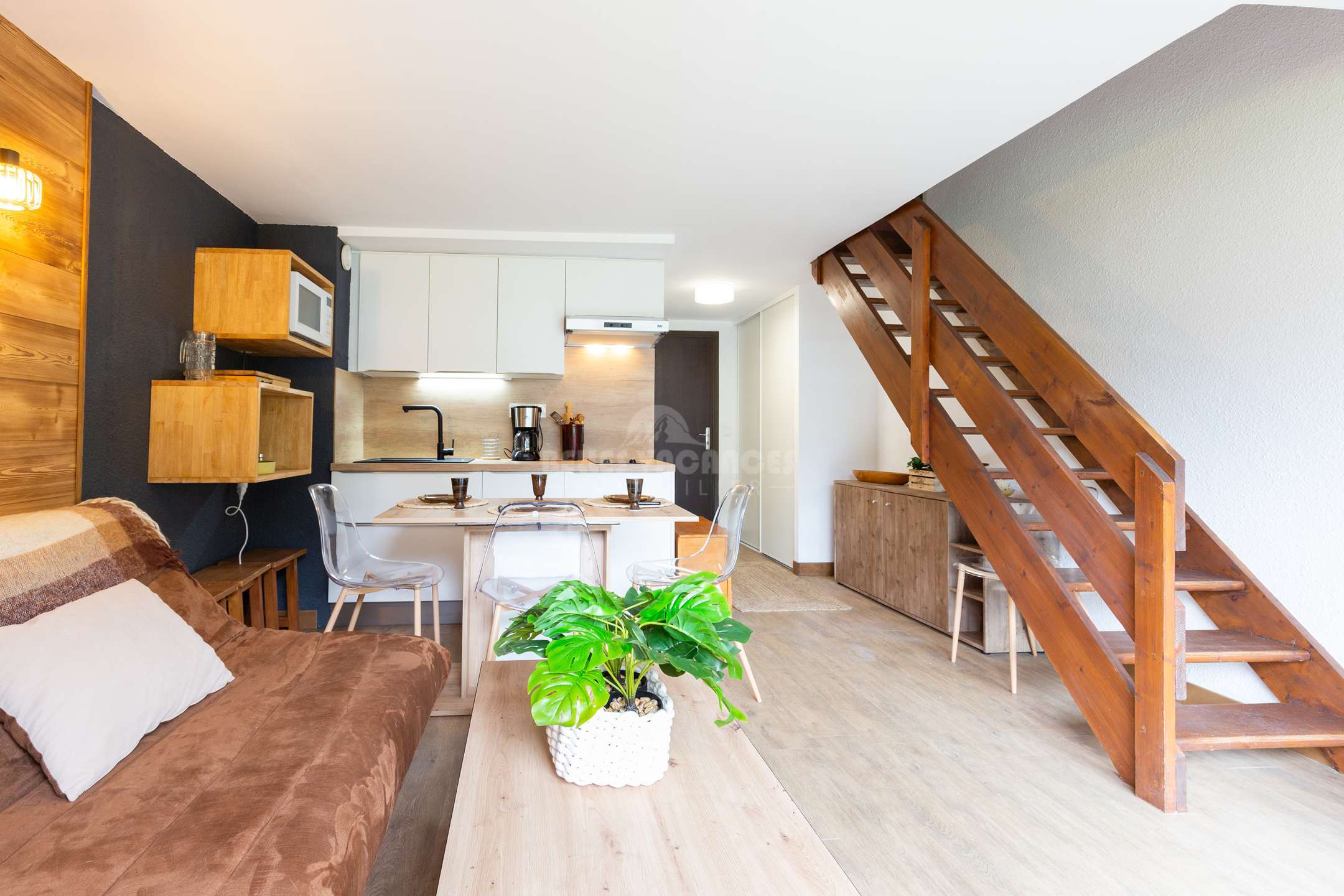 il dispose d'une entrée- Séjour canapé-téléviseur-Kitchenette- Salle de bains -wc séparés- chambre à l'etage avec un lit deux personnes king size et une deuxième chambre avec deux lit 1 personne /